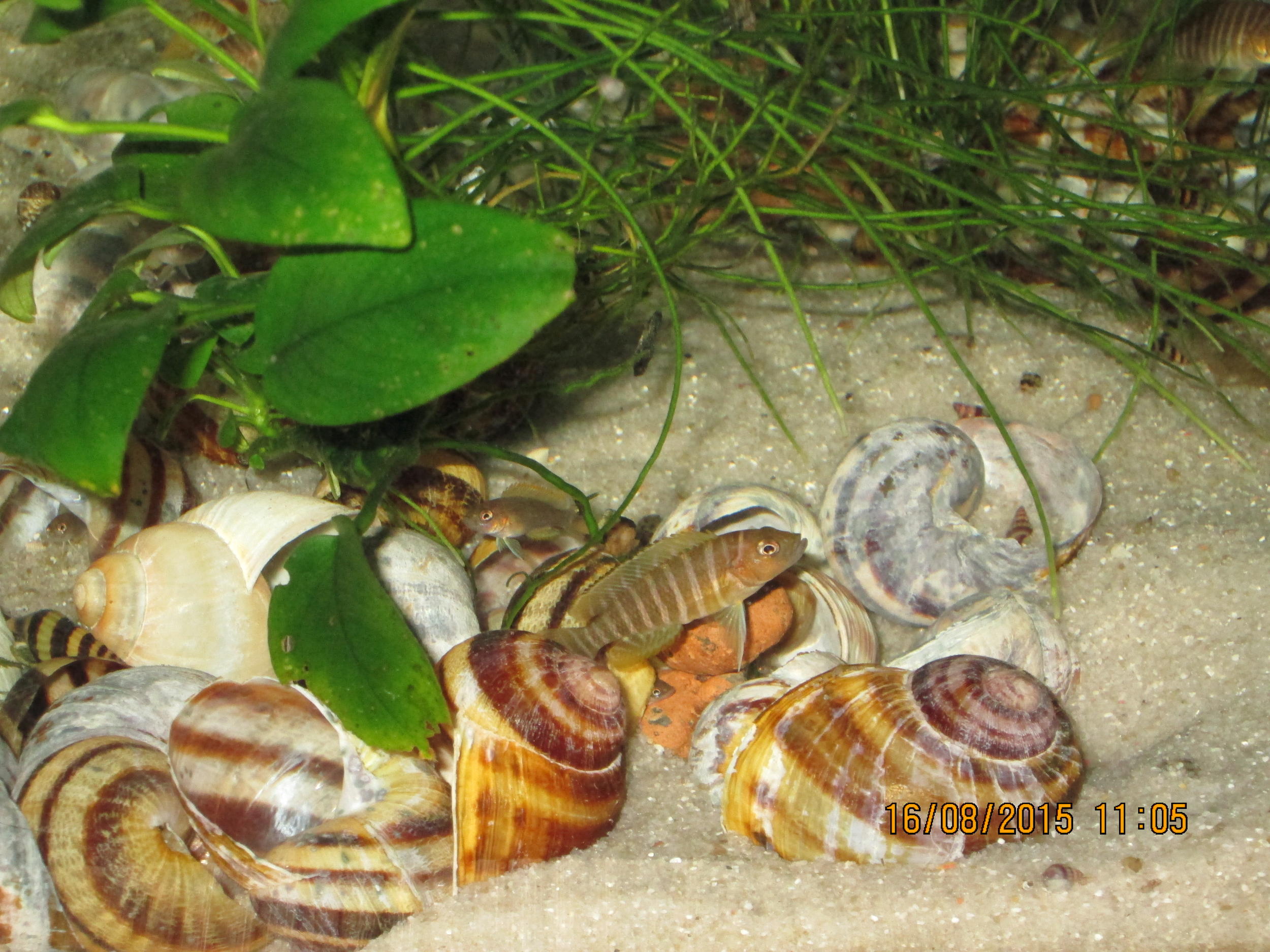 Вчера производил чистку внешника и уборку в аквариуме, заодно решил немного иначе разложить ракушки для Lamprologus Ocellatus Gold. Только полез рукой ближе к укрытиям - 4 из них сразу же спрятались в ракушки, а двое заняли оборону и по очереди начали бросаться на мою руку) Очень любопытно было наблюдать как эти малявки защищают свой дом