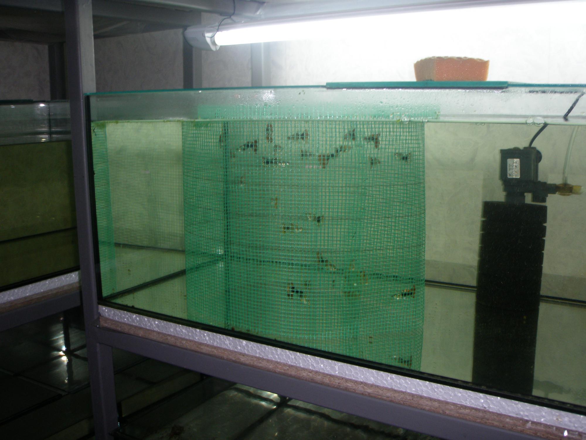 Кроме этого стоит помпа с мочалкой , как в обычных аквариумах . Живородка , как и икромечущие - нерестится по моим наблюдениям в 80-90 % случаев в темное время суток , обычно с рассветом. Это связано с тем , что родившийся малек должен "раскрыться" , глотнуть воздуха и "спрятаться" . В светлое время он становится легкой добычей хищников и канибалов- родителей.Все это закреплено естественным отбором генетически и присутствует у рыб содержащихся в аквариумах. Большинство случаев меток самок днем я связываю со стрессом - подмена воды , испуг , маленький объем и т.д. В скатке рыба мечет в обжитом привычном помещении. Если в скатке досточно много производа - работа сводится к вылавливанию родившегося малька и при желании/перекорм рыбы/ собирании отходов трубочкой из отсека для малька , куда эти отходы скатываются. Гигиеническая уборка делается не только в скатках , но и в любых аквариумах. При содержании в сетчатых садках - сложно отлавливать малька - мешает садок. Кормление малька прямо в аквариуме с садком с производителями приводит к еще большим проблемам - в часности разновозрастные мальки - угнетаются маленькие. Малька желательно кормить до 10 дней четырехразово понемногу науплиями артемии /живут 3 часа /. Старт для малька очень важен.