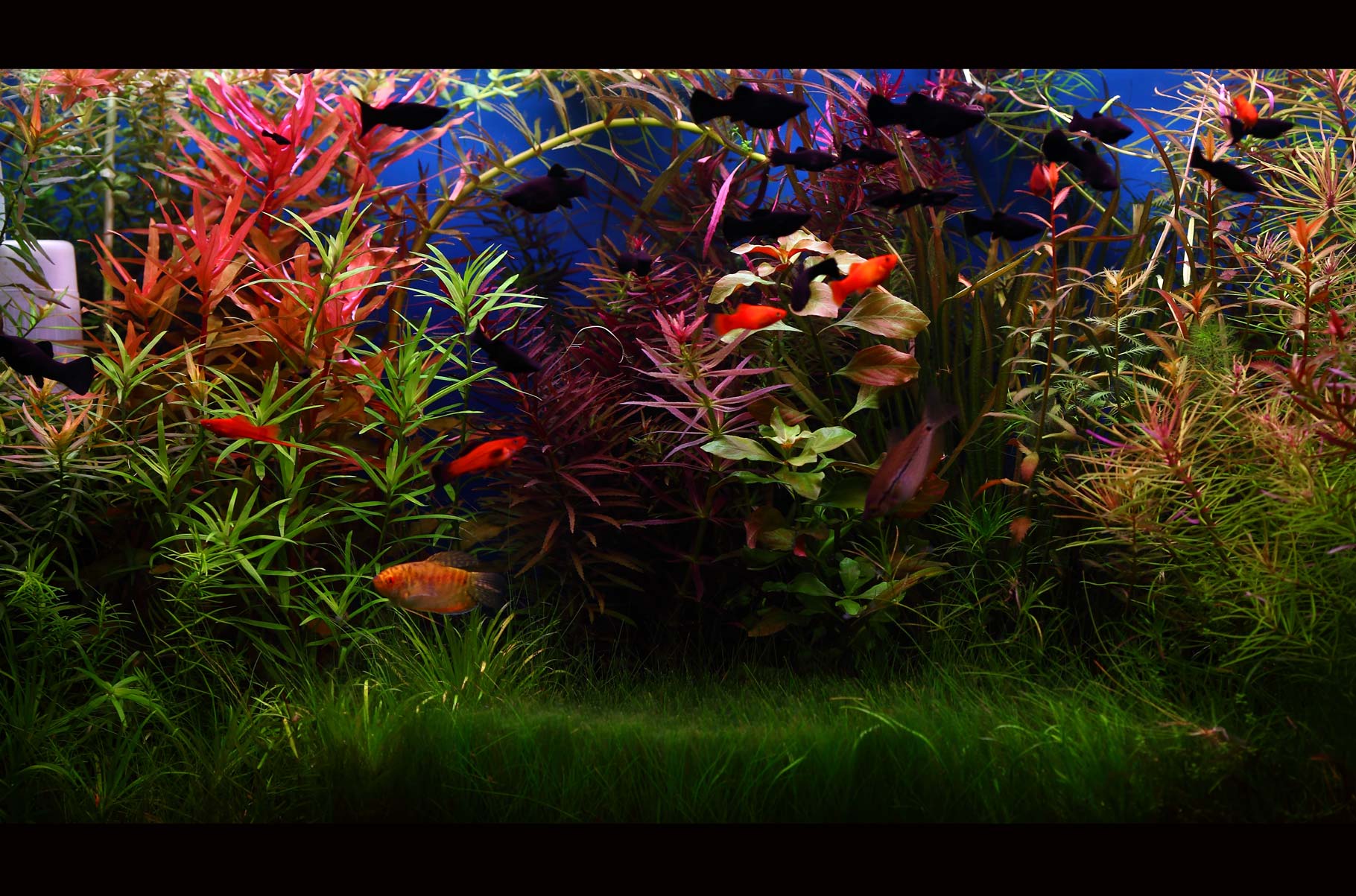 Вот аквариум на 8-й день, воду еще не менял, некогда, много работы. Потерь нет, разве что у стриженного элиохариуса, кажется обожгло верхушки(срезы).