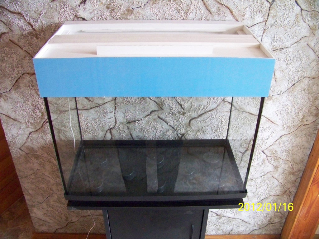Также дополнительно могу предложить крышку на этот аквариум из ПВХ собственного изготовления. Влагостойкие патроны. В крышке установлены 2 лампы Т8 15Вт. Есть возможность установить еще 2. ЭПРА находится на внешней задней стенке крышки в коробе 4*4см. Крышка спроектирована таким образом, что при обслуживании аквариума ее снимать не надо, открываются длинные лючки вдоль передней и задней стенки, и можно спокойно работать внутри, свет продолжает гореть -- все видно и удобно. Крышка не окрашена (на фото передняя стенка голубого цвета -- это защитная пленка, она легко снимается). Крышку можно обклеить самоклейкой или покрасить в любой цвет. У меня есть черная краска в баллончике, так что при необходимости можно покрасить. Цена крышки 150 грн.