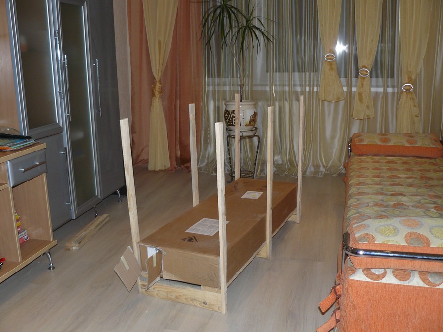 В перерывах между делом было выпита бутылка виски и два литра пива. Не смотря на это, тумбу собрали и аквариум установили.