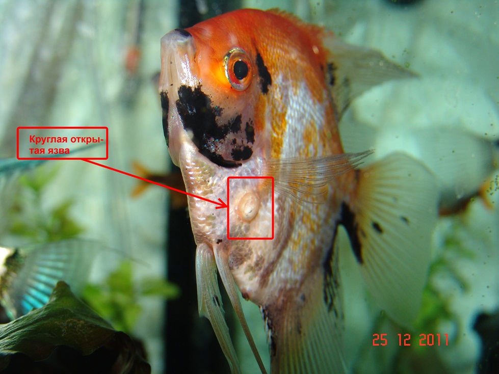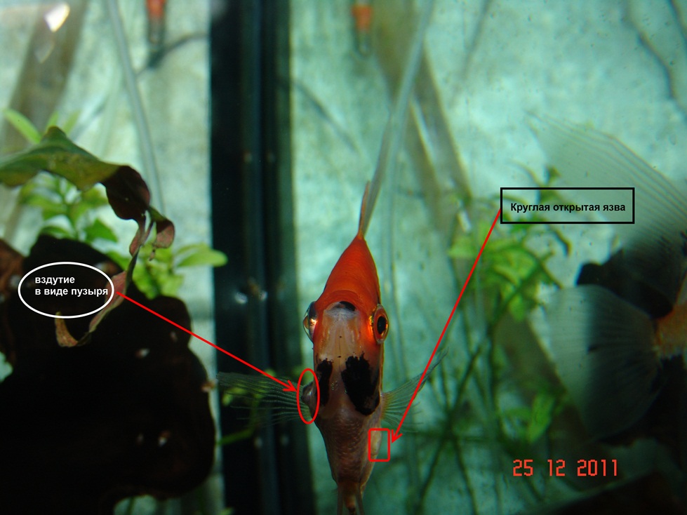 Здравствуйте Вика! Спасибо за ответ в теме. Началось это (веренее я заметила) около 1,5 месяца назад. Первой я увидела язву на одной синей скалярии. Думала механическое повреждение. Но она не заживала и из розовой стала белой. Я испугалась и рыбу удалила...Сейчас поражены 2, и 2 здровых скалярия.... На одной только вздутие, на второй(см. фото) вздутие и язва. Если появятся идеи, обязательно напишите, я в полном замешательстве...