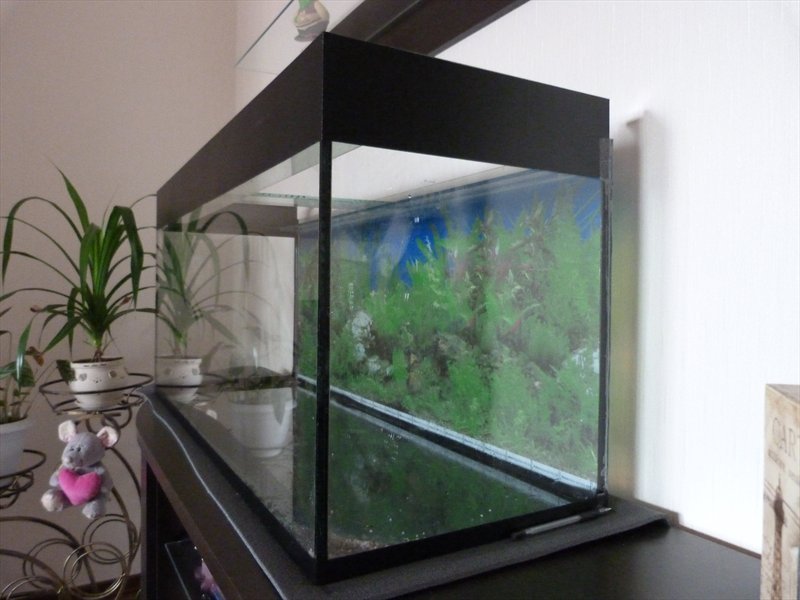 Продам прямоугольный аквариум 100*35*45 (д*ш*в), ребра жесткости по длине аквариума, силикон черный. Аквариум практически новый, вода набиралась на неделю только до половины (т.к. комод прогнулся, а места для специальной аквариумной тумбы нет). Крышка из обклеенного черной пленкой стекла, состоит из двух частей, без света.