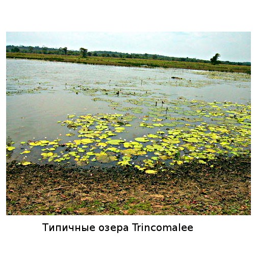 В конце марта, начале апреля, в начале сухого сезона, уровень воды уже сильно снижен. На север Тринкомали, есть большие пруды и озера, по берегам которых цветет Nymphoides indica и Neptunia зр.