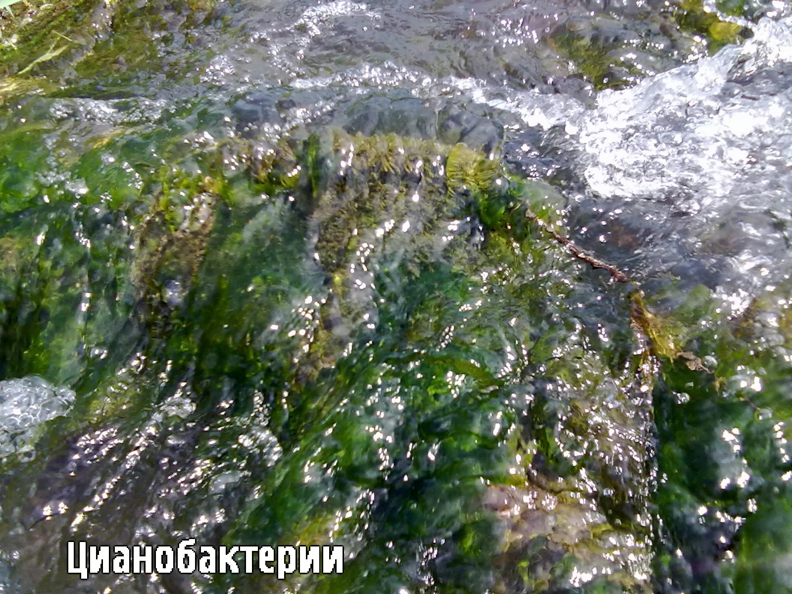 Вода вытекающая из болота заметно прозрачней. Уже встречаются надводно Veronica подводно мох Leptodictyum riparium он же стринги,но они явно прогрывают в конкурентной борьбе водорослям.Бросаются в глаза толстые пленки цианобактерий.Покрывая мох камни они активно поглощают соединения фосфора,подготавливая воду для следующей армии„зачистки".Она ниже по течению.Это зеленые водоросли.Длинные как лисття валлиснерии,пузырчатые изнутри,эти водоросли опутывают все предметы.Встречается хара.Еще дальше, заметно возростает пышность и биомасса растений Veronica,а водоросли идут на убыль