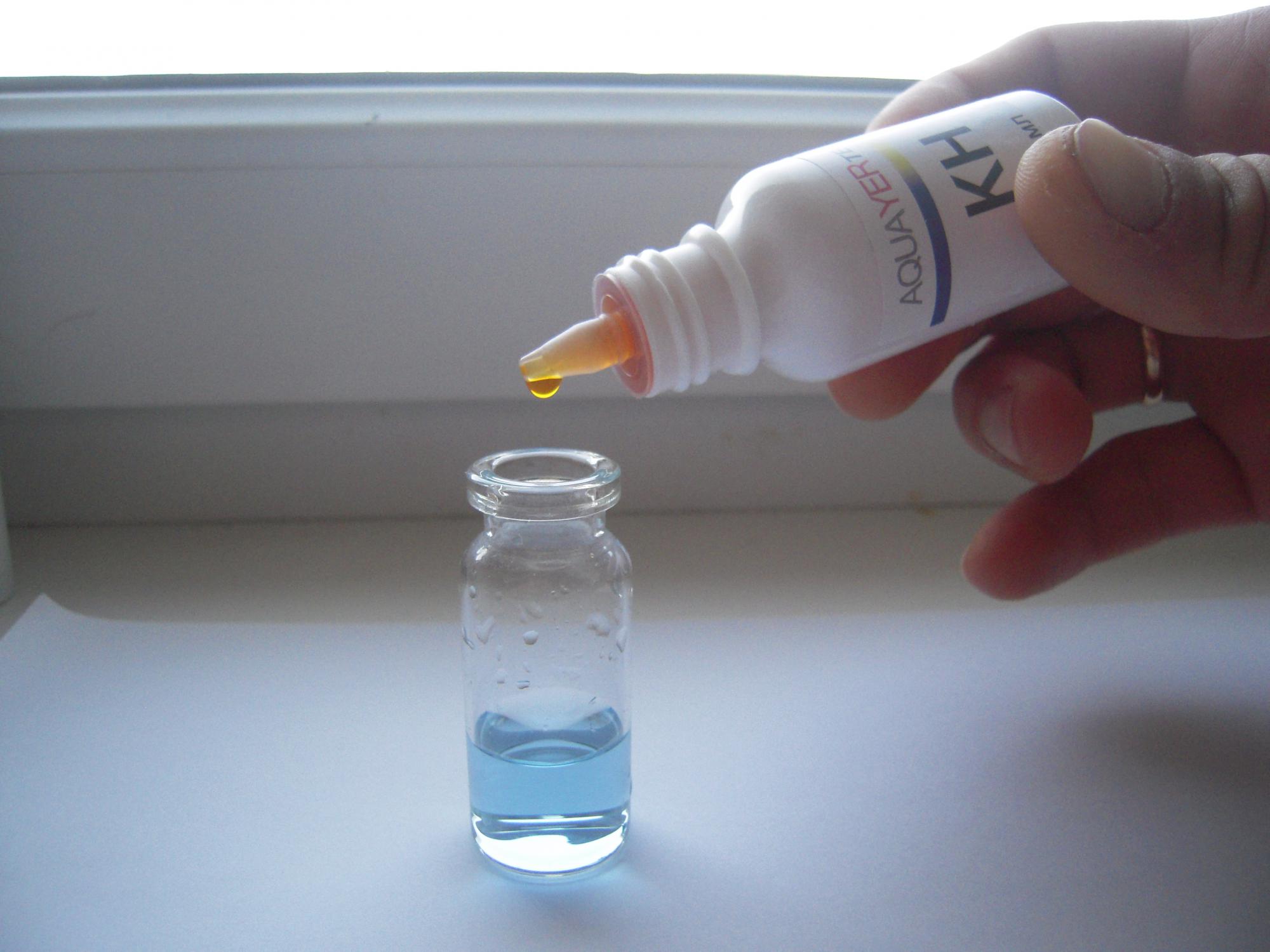 и вот последняя 9-я капля, реагент окрашивает воду в желтый цвет. kH=9. Все просто и легко