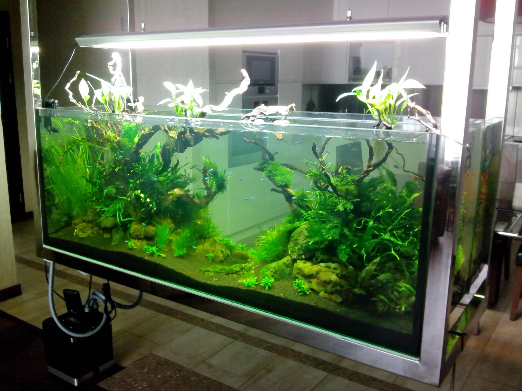 Интересный аквариум, но не могу понять зачем к потолку?) Под аквариумом кто-то ходит?))