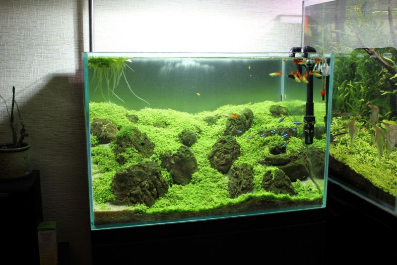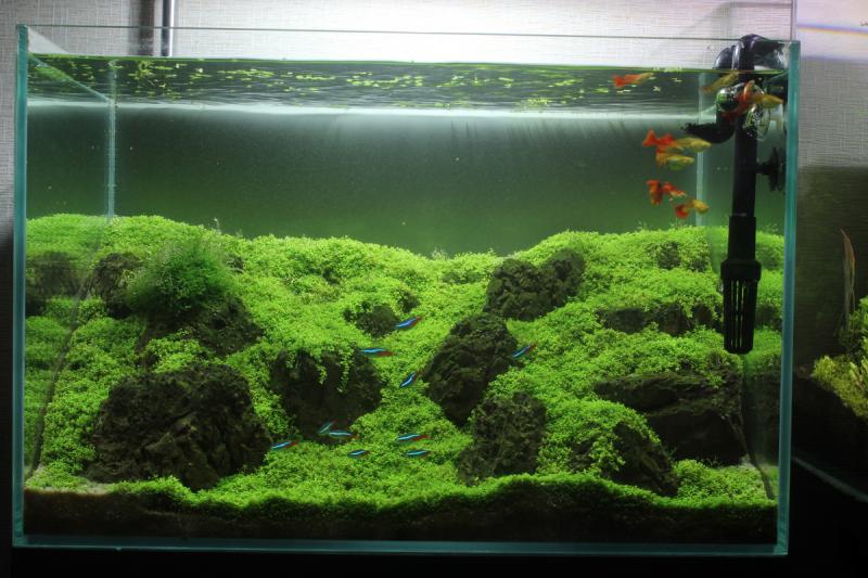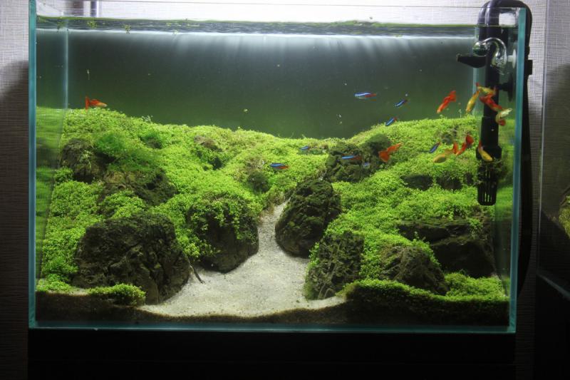 Камни для такого аквариума маловаты. Нужно выбирать камни соответствующие размеру аквариума. Для красивой композиции нужен выбор камней, то есть сотню перебрать и выбрать 5-7 оптимальных. Нужно ехать во Львов и там на месте за рюмочкой чая сидеть и выбирать))) Куба вроде мелкая, но её так много она лезет везде и она съела половину размера камней)) Научился бороться с кладофорой и риччией-перекись))) и в целом аквариум нравится. Большое зеленое ровное пятно, но хочу через какое-то время разобрать и сделать чего-то нового. И так практикуясь научусь творить красоту))) И возможно засяду за изучения фотографии..или кого-то начну напрягать))) Дамы и Господа Спасибо за внимание!!!