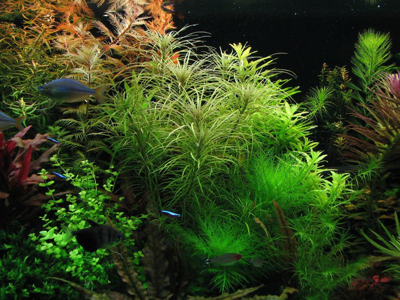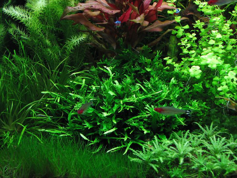 Параметры воды Gh 10, Кн 5-6, Рн 6.5, свет 9.5 часов без перерывов, 160 W + отражатель парабола 4 лампы, осрам 3000К, 2-10000К, 1 гролюкс 8500К,Со2 балонн подача по времени через час после включения света по 30 минут каждый час после полудня светового дня подачу прекращаю запирание эл. клапаном, удо нират 20 мл/л.неделю, К-20 мг/л.неделю, Фосфат 3.4 мг/л.неделю Fe 0.2 мг/л.неделю, микро по В 0.025 мг/л.неделю, подача через дозатор порционно ежедневно сразу с включением света.