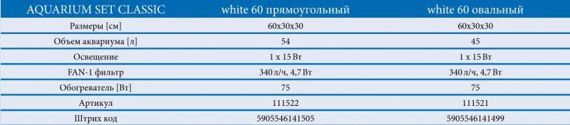 CLASSIC WHITE состоят из выше описанных крышек и аквариумов емкостью соответственно 54 л (версия с плоским передним стеклом) или 45 л (с овальным передним стеклом). Они оснащены белой рамкой, внутренним