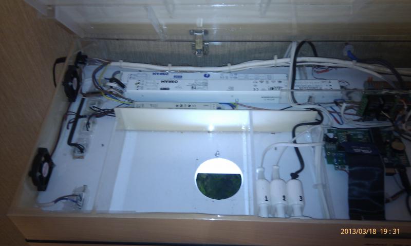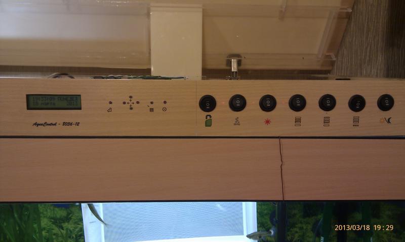 Хотел, чтобы рассвет-закат, чтобы все по расписанию, чтобы управление еще ручное (так, на всякий случай). В общем выбрал в качестве управления набор Мастер КИТ 4-х канальный контроллер, спаял, доработал до 12 каналов, при этом 4 еще не задействовал (автоматическая подача СО2 впереди и измерение РН). Завел управление каналами через переключатели (автомат.управление-выкл-ручное управление). При повышении температуры в крышке - включаются вентиляторы, вне "светового дня" работает светодиодная подсветка, ночью - луна. Ну и т.д. Кому интересна реализация - расскажу подробно. Выкладываю свою работу, может кто какую идею почерпнет, как я, когда штудировал подобные темы.
