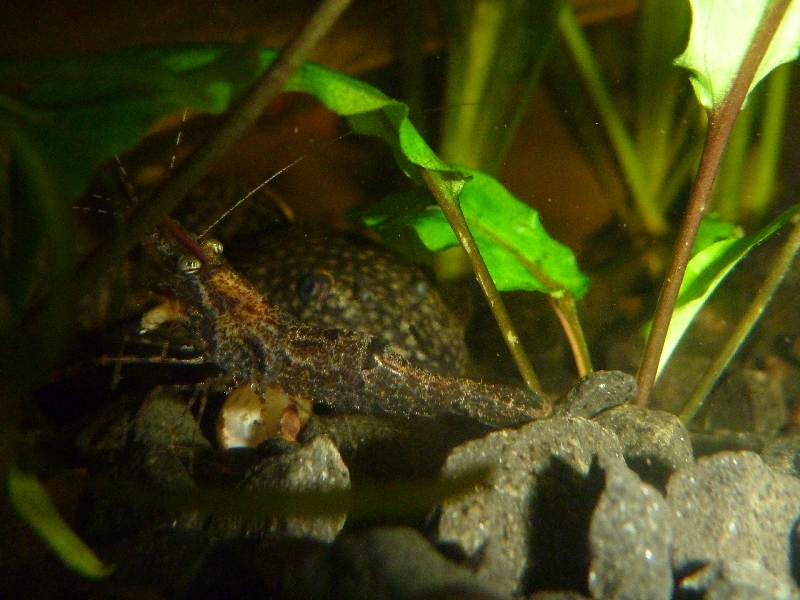 Э-эх, такие классные чудовища пропадают. Так забавно смотреть, когда в густо заросший аквариум кидаешь таблетки сомикам. И кроме сомов к таблеткам начинают из зарослей валлиснерии выползать эти красавцы, размахивающие клешнями и доказывающие сомам, что таблетки только называются сомовьими, а на самом деле они для макробрахиумов. Вот тут и начинается - анцитрусы сосут таблетки активнее, а макробрахиумы чуть ли не из пасти их вытаскивают. А если кому то что то удалось отобрать, то обязательно найдётся родственник понаглее и попытается отобрать таблетку уже у тебя.