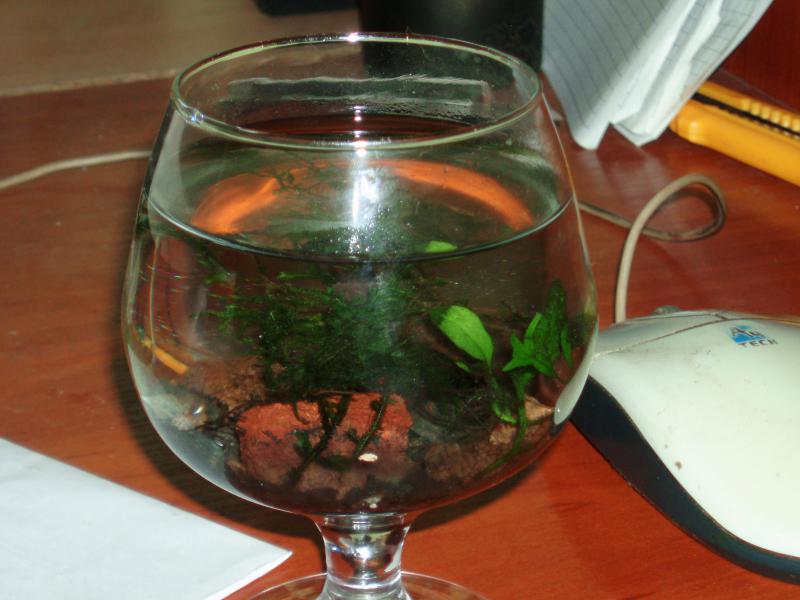 Лампочек у меня не было, а коньячный бокал был. Результат перед Вами. Супер-нано аквариум объемом 200 мл.