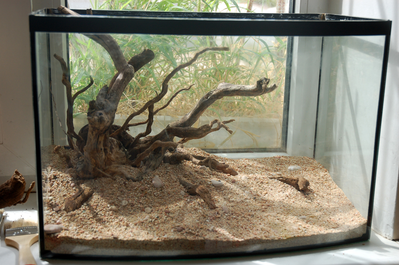 Очередное перерождение оазиса на кухонном подоконнике, на этот раз с питательным грунтом и корягами.