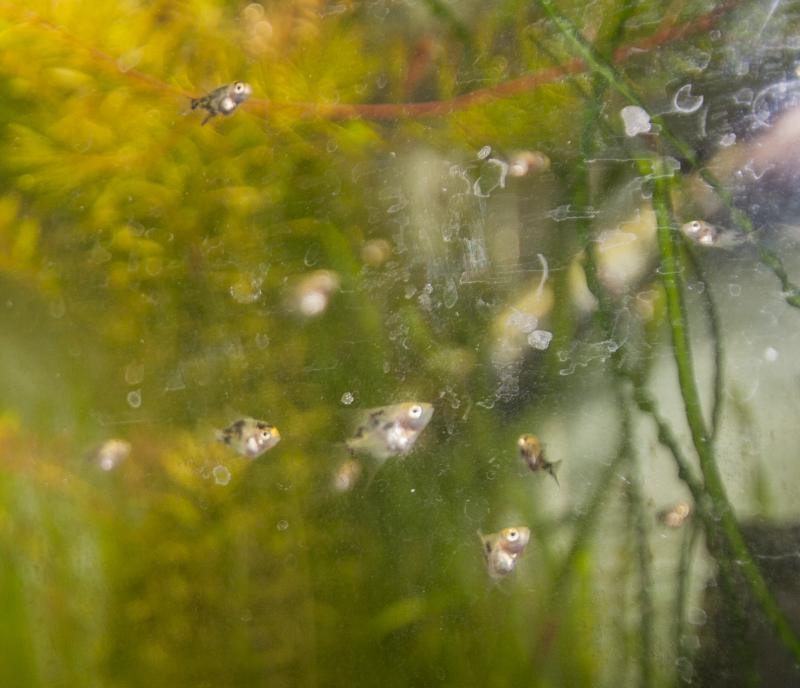 мальки три дня как переехали из 10 в 80 литров. Кормежка резанным мороженым трубочником. Размер самых больших 1,5 см