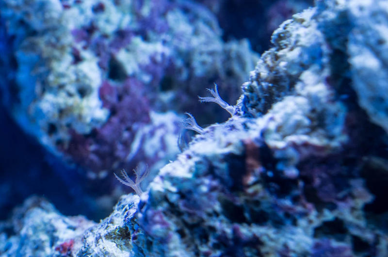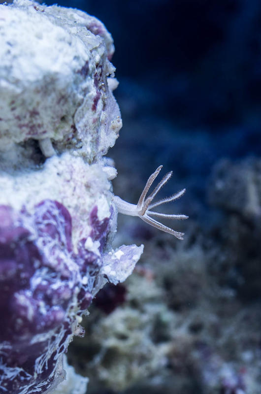 На следующее утро после засолки обнаружили несколько микроскопических веера червей, белую и зеленую губки - по 0.5 см каждая из колоний, и гидроиды. Сначала, конечно, провели идентификацию - сходство с эйптазией несколько пугает, но вроде не похожа.  На фото эйптазия везде гладкая, без ресничек, у нас же - реснички! На третий день возле первой появились намеки на колонию - еще несколько похожих пупырышек! Ну и неможко другие - тоже много - целый луг.  Так же показались маленькие зеленые палочки - в большом количестве, практически везде по камням. Наверное, то что называю зеленым взрывом. Ждем продолжения.