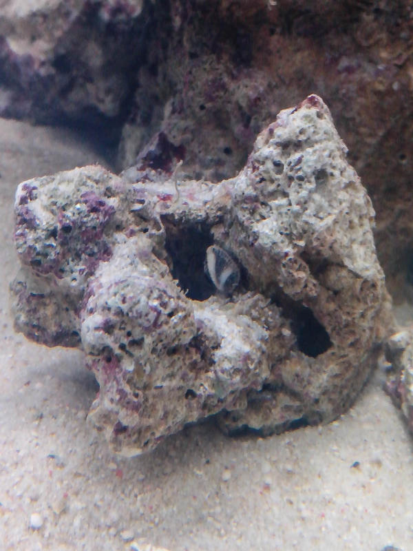Так как часть камней сознательно брали передержанными, чудо не случилось. Ни одной офиурки не нашлось )-: Но за три дня уже есть первые вопросы. В первую же ночь из одной дырки выползла непонятность и скоропостижно уползла в другую дырень. После этого никто ее больше не наблюдал ни разу, хотя чуть ли не пост возле аквы устроили и передавали по смене - "ракушечка не появлялась".
