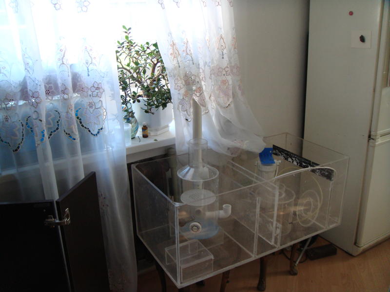 Самп из оргстекла- 110-50- 40. из четырех отсеков-пока не знаю, что и как там расположится... пенник от Логинова, брал на форуме на помпе Аква-Мед3500, мощный с запасом, может рыб захочу побольше- красивые они морские...