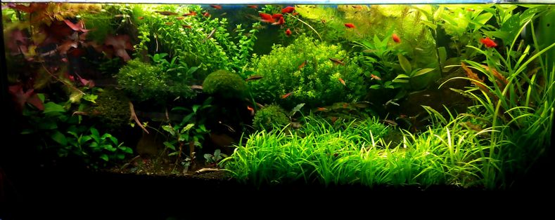 Свет : 90 Вт, из них 60 Вт гролюкс остальное 865 спектр. все лампы T8 по 15 Вт . Грунт : снизу гранит, сверху Fluval stratum. CO2 нет и видимо не будет. длина 100 ширина 31 высота 55. лью калий, микро и железо.