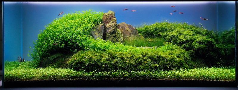 Интересно. Есть несколько вопросов к Вам. Что за камни Вы используете? Что за грунт под светлым? Какая почвопокровка используется? Почему сфотографировали под углом? Зачем обогреватель?(неужели в Болгарии там холодно?  ). Извините что много вопросов, но действительно интересно.  Не очень понравился полукруг из камней в правой трети аквариума,если честно.