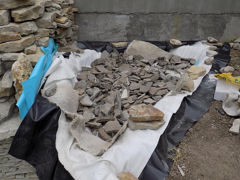 Это не лапша, это торцовка. Как по мне так она имитирует слоистые осадочные породы. Ну не козочкой же облицовывать... А девушка с инспекцией появилась, ну и помогла пленку с текстилем в биоплато уложить.