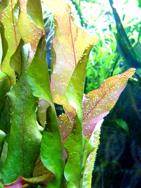 Растет в водопроводе, быстро, верхняя сторона листа сочно оливковая, нижняя нежно розовая.