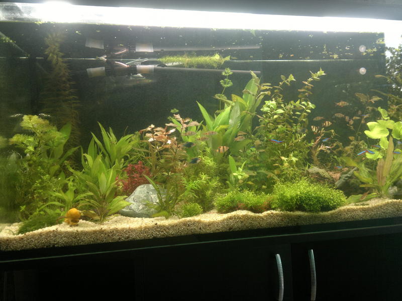 Созвонились, попросил совета по запуску и его УДО. Проблема состояла в том, что аквариум стоял в летнем домике и запуск был всего на месяц - потом аквариум нужно будет опорожнять и перевозить. Ну думаю как раз наберусь опыта за месяц) Заказал всяких растений, УДО у DEPSa, выкинул свой морской венигрет с пляжа( хочу заметить что вода у нас достаточная жесткая, артезианская pH-8, GH 13-14, KH 10-11) Купил кварцит 3-5мм, переделал крышку сделав примерно 1Вт/л, СО2, внешник RESUN и ЗАПУСТИЛСЯ) Причём в силу отсутствия терпения запускался быстро. На второй день были посажены растения, на третий день уже заселен барбусами, неонами и маленькими сомиками))) Само собой темпы роста у меня были далеки от того как перла растючка у Прохора, но я всё равно не мог нарадоваться своим аквасом. Долго не мог поймать соотношение нитрат фосфат. Нитрат был 10-15, а фосфата едва доходило до 0,5 и пока я не залил правильную дозу РО4 макро не лил, только микро чередуя с хеллатом Fе. К сожалению сам запуск я не додумался сфоткать. но гдето через дня три сделал несколько снимков