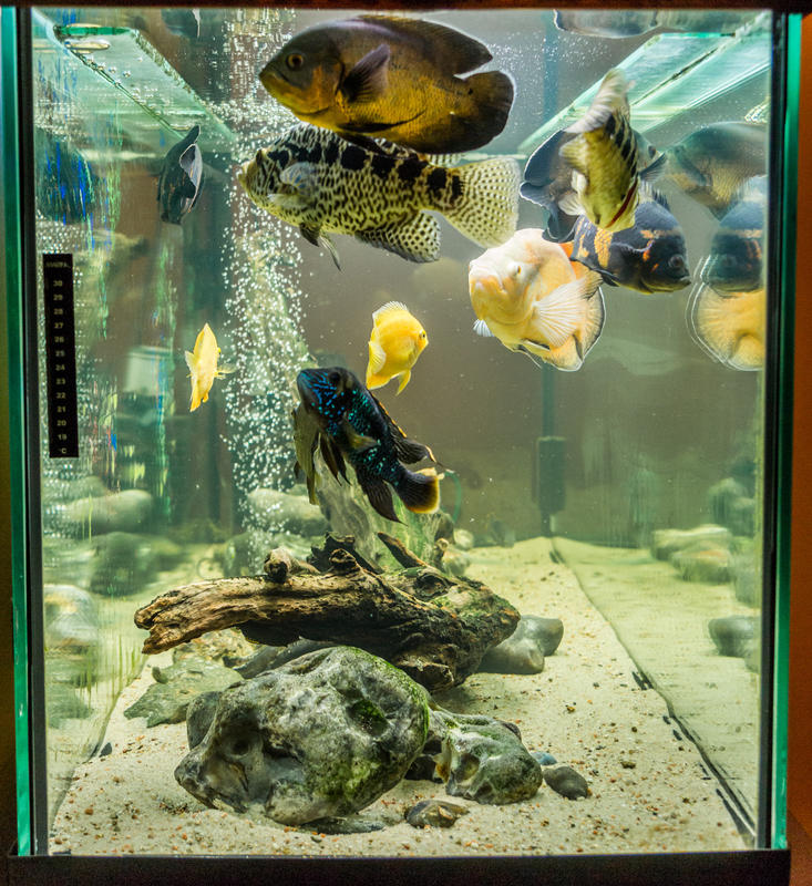 Полчаса прошло после того как накормил всех свежеразмороженной тюлькой, по одной рыбке каждому, кроме самца манагуанца, потому как он стал трусом и прячется под корягу при кормлении размороженной рыбой, а в остальных случаях лопает корм вместе со всеми.