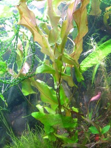 Очень красивая барклая лонгифолия. Верхняя сторона листа оливковая, нижняя красная. Ближайшая родственница нимфей, не сложное и быстро растущее растение. Считается, что барклая подавляет рост водорослей.