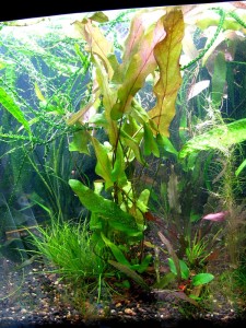 Очень красивая барклая лонгифолия. Верхняя сторона листа оливковая, нижняя красная. Ближайшая родственница нимфей, не сложное и быстро растущее растение. Считается, что барклая подавляет рост водорослей.