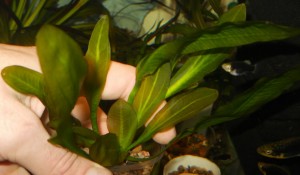 Вот описание автора. Свое название получил за жесткие листья-при пересадке взрослого куста они постукивали друг о дружку, ну и военный корабль есть такой. Высота до 35 см, ширина листьев-до 6-ти см. Молодые листья прозрачные, пожилые — полупрозрачные, глянцево-матовые. С размножением, приживаемостью и выносливостью проблем нет никаких. В розетке масса листьев, старые — не разбежались гнить. Из воды не вылазил. Резюме — зашибись. Получил лестные отзывы от людей его содержащих.