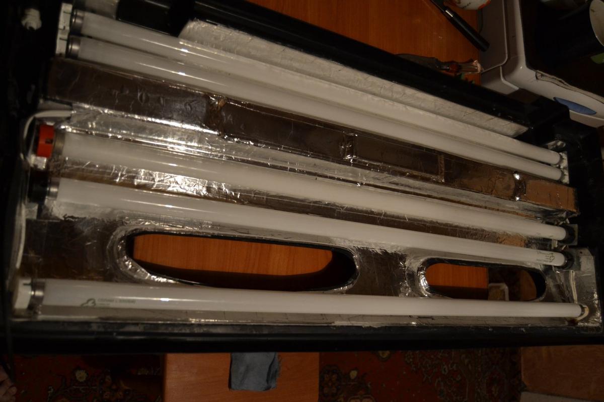 2. Аквариумная крышка (5ть ламп OSRAM Lumilux 30w (840/830) - три из которых холодный свет и две теплый, и того 150w), крышка обклеена мной алюминиевой светоотражающей лентой - эффект просто супер, перепробовал кучу возможных вариантов до этого;