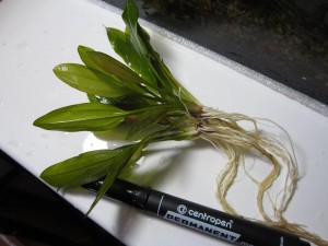 Эхинодорус компактный, вырастает до 20…25 см. Название его переводится как «цифровая живопись» и рисунок из жилок на листьях, особенно на молодых, представляет абстрактную картинку, которая соответствует названию.