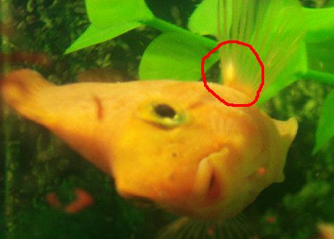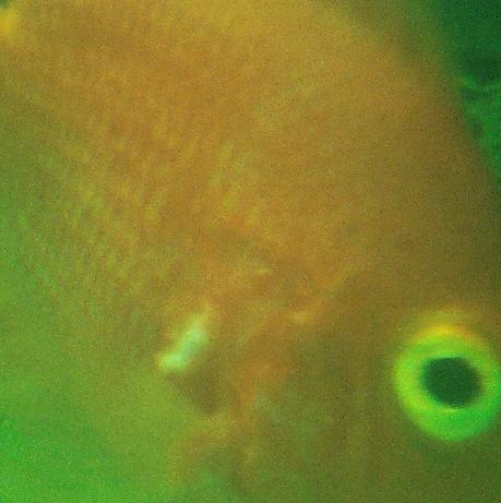 возле жабры нарост вскрылся,чешуи на нем нету,просто белое мясо или еще что то .