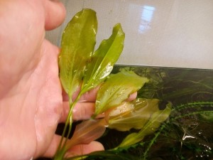 Куст относительно компактный (для свои размеров — 50-60 см.) не раскидистый, прямостоячий, листья овальной формы на длинном черешке. Прекрасно подойдёт для высоких аквариумов.
