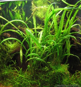 Красивое, мощное, неприхотливое растение. Отлично смотрится на заднем плане и по углам в больших аквариумах. Не требовательно к свету и удобрениям, растет медленно. В высоту достигает 60 см.