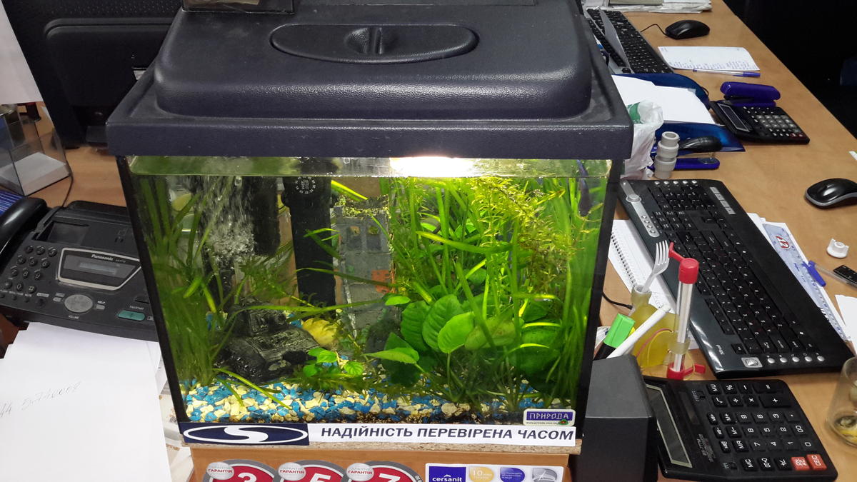 Хотел поставить аквариум побольше,но руководство меня не поддержало,поэтому приобрел малыша на 35 и расположил его прямо перед собой рядом с монитором..задумкой весьма доволен)