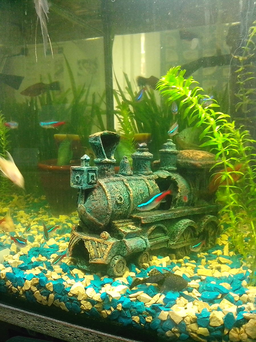 Сейчас баночка конечно выглядит лучше, но грунт - вырви глаз. ))) Сюда можно было бы неонов, а тетрадонам нужны катушки, так что скоро придется вам их искать, у меня они когда жили, съели даже грунтовых улиток. ))