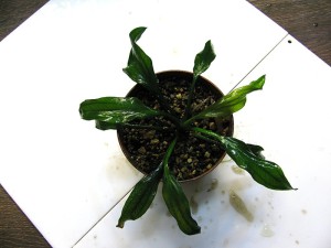 Изумрудно — темно — зеленые ланцетные листья, очень жестколистный эхинодорус не большого размера, очень декоративное и редкое растение.