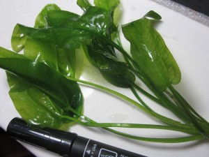 Корневищное растение. Листья сначала сидячие, затем черешковые. Листовая пластинка сначала линейная, затем яйцевидная или ланцетной формы, длиной 6-15 см, шириной до 3,5 см, основание округлое или сердцевидное, верхушка тупая, ровная до слегка волнистой, слегка прозрачная, нежно-зеленая с темными поперечными жилками. При длительном освещении (12 ч и более) растение сбрасывает подводные листья и на длинном черешке появляются плавающие и надводные листья с листовой пластинкой длиной 6-14 см, шириной 5-13 см, округлой формы, с сердцевидным основанием, тупой верхушкой, светло-зеленого цвета. Чтобы растение не образовывало плавающих листьев его освещают не более 8-10 ч. Препятствовать быстрому образованию плавающих листьев при освещении 12 ч можно посадив растение в чистый песок без питательных веществ и постоянно обрывать полностью распустившиеся листья или поместить корневище в пластиковый мешок и погрузить в грунт, чтобы препятствовать росту корней. К.Ратай рекомендует время от времени, захватив черешки вытягивать на 1-2 см растение из грунта, что повреждает часть его корней и растение прекращает рост.
