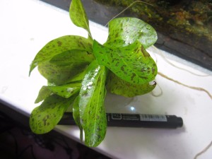 Это сорт Echinodorus «Ozelot» имеет интересные волнистые листья, покрытые большим количеством темных пятен, которые красиво контрастируют с зеленым цветом листьев.