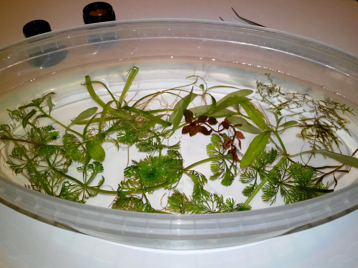 Раствор последний (тот что на фото). 1л. дистиллированной воды + 200мл. маточного раствора Купороса. Так как из растений ничего не выпало, после их обработки было решено хорошенько ополоснуть в растворе кормушку из общего аквариума в которой я выращиваю полянки Монте Карло. Там в корнях, как правило, всегда что-то есть. Живность: