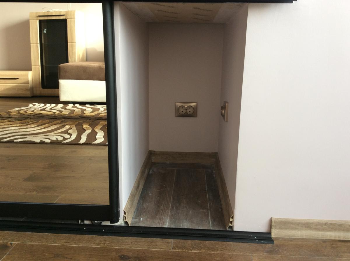 Единственная сложностью было придать этой каменной тумбочке пристойный вид снаружи, закрыть вид будущих фильтров и другого оборудования.После долгих поисков и размышлений была установлена раздвижная система из алюминия и стекла, как в стандартных шкафах купе. Очень удобно, не боится влаги и заказать можно на любом рынке у торгующих шкафами купе в любом цвете и с любым рисунком, или просто с зеркалом как у меня ( самый бюджетный вариант). Смонтировать ее на месте легко, у меня аква и столешница одной ширины, поэтому я крепил верхнею направляющею к боку столешницы, просверлил в ней сбоку сквозные дырки и закрутил саморезами в передний торец столешницы.