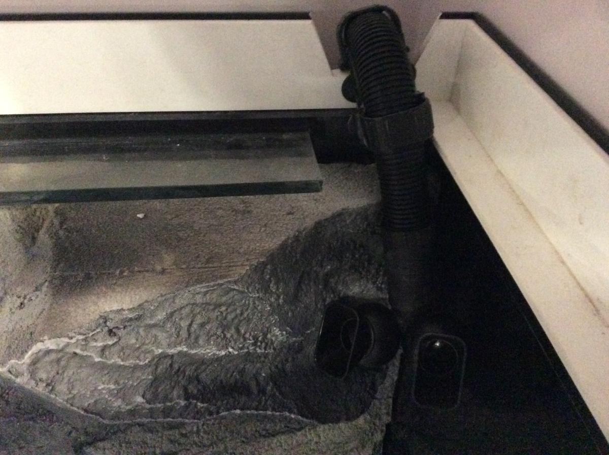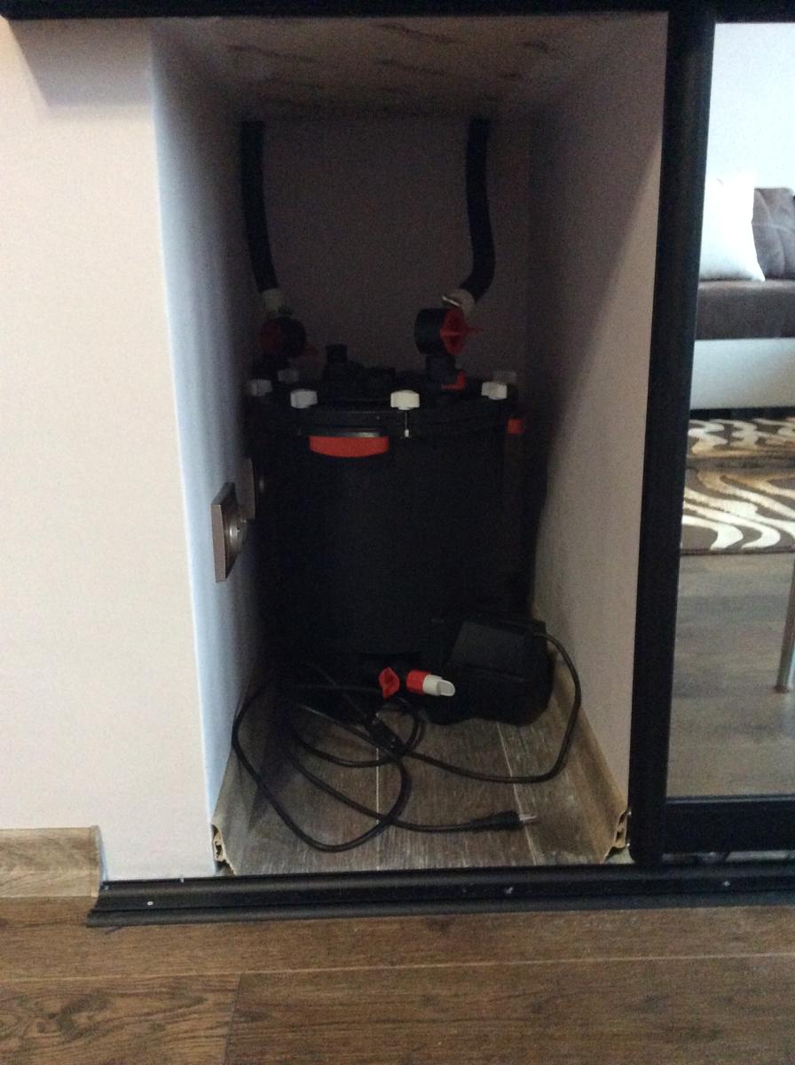Сегодня был установлен фильтр Fluval fx-6. Наполнение стандартное: верхняя корзина крупнопористые мочалки, средняя и нижняя корзина биокерамика, мелкопористую тонкую мочалку убрал из за того что быстро забивается. Забор воды был опущен в специальную нишу в фоне, вода будет поступать в нее сбоку через сантиметровую щель между фоном и стенкой аквариума. Выпуск воды был установлен в противоположной стороне аквариума, а его оба сопла были направлены под углом примерно 45 градусов к будущей поверхности воды для создания бурунов и волнения, что бы активно перемешивать воздух с водой и насыщать ее кислородом. Поэтому компрессора в аквариуме не будет.