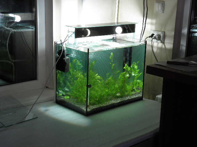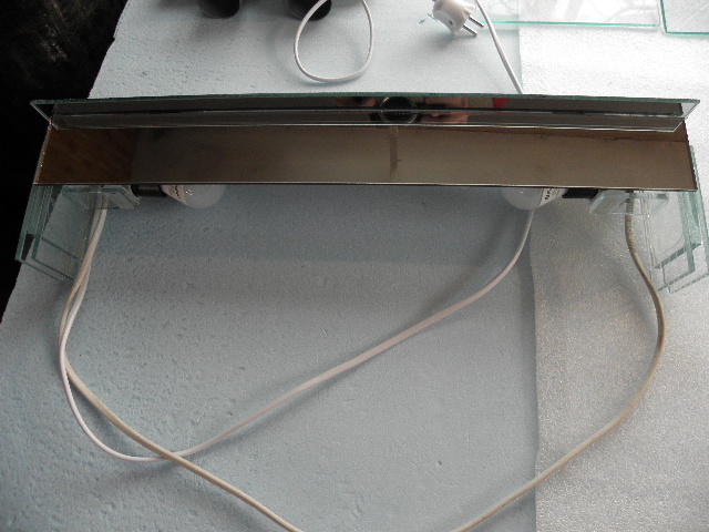 2 кусочка стекла 5 см на 3 см это пойдет чтобы закрепить держатель для патрона. Зеркало кусок 50 см на 10 см. Матовое или темное стекло 50 см на 6 см, чтобы заслонить лампы спереди. Силикон. Держатель для трубы 25-27 мм.- 2 шт. Патроны Е14, вилка, провод, лампочки. Особо рассказывать нечего- по фото все ясно. Все очень примитивно и просто. В основном тут небольшие кусочки стекла, которые стоят дешево в мастерских, так как это отходы производства. Понимаю, что тут особо нечем хвастатся, так как именно нужно было простое и дешевое решение и клею из стекла первый раз. Может кому и пригодится идея. Лампочки 6400 К для травника самое оно пойдет. Выходит 1200 люмен в сумме. 20 люмен на литр. Без СО 2 простым растениям самое оно. В отличие от закрытых крышек, тут нет угрозы для лампы со стороны перегрева и конденсата- все отлично естественно вентилируется, так что гарантией не прийдется воспользоватся, лампы будут работать долго. Подвинув светильник к заднему стеклу очень легко обслуживать аквариум, садить растения, при этом свет включен и не мешает светильник. Два бортика ножек делают светильник весьма устойчивым.