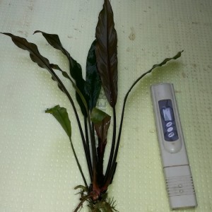 Вашему вниманию предлагается взрослый куст*Piptospatha sp ‘Super Blue’. Пиптоспаты также как и Буцефаландры можно содержать под водой, хотя более быстро и стабильно себя чувствуют в паллюдариуме. Данная пиптроспата имеет красивые глянцевые темнозеленые листья, цветет красными цветами похожими на фонарики. В качестве лота выставлена часть уже взрослого куста, размер растения 35 см.