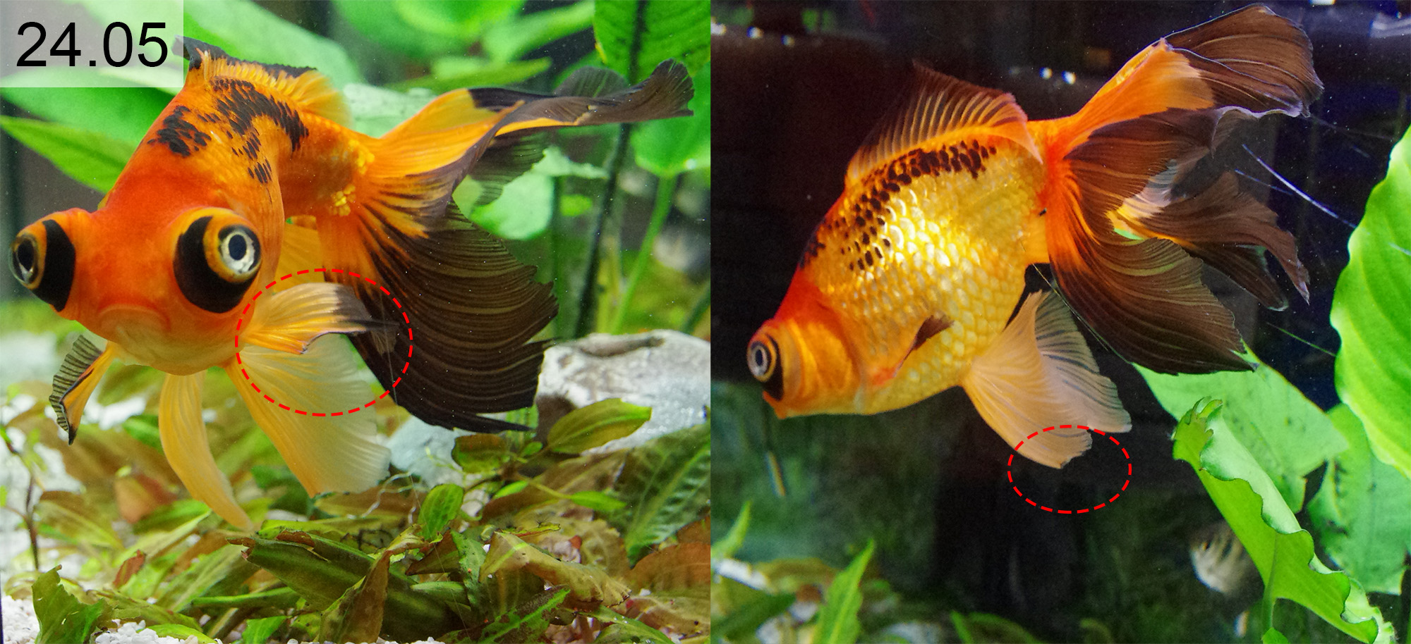 Полтора месяца назад заметил, что у телескопа как будто немного счесало края левых грудного и брюшного плавников. Думал, может это пресловутая плавниковая гниль, но вроде бы по фотографиям не похоже. Тем не менее, плавники очень медленно, но всё же уменьшаются. Проблема только с двумя плавниками и только у телескопа.
