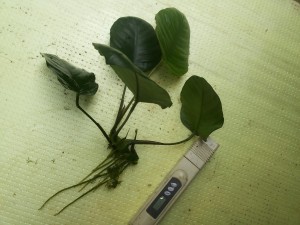 Вашему вниманию предлагается куст Anubias barteri «Wrinklend Leaf». Довольно интересный азиатский гибрид хорошо чувствующищ себя как над так и под водой, несет морщинистые темно-зеленые широкие листья на длинных черешках, высота взрослого куста до 40 см.