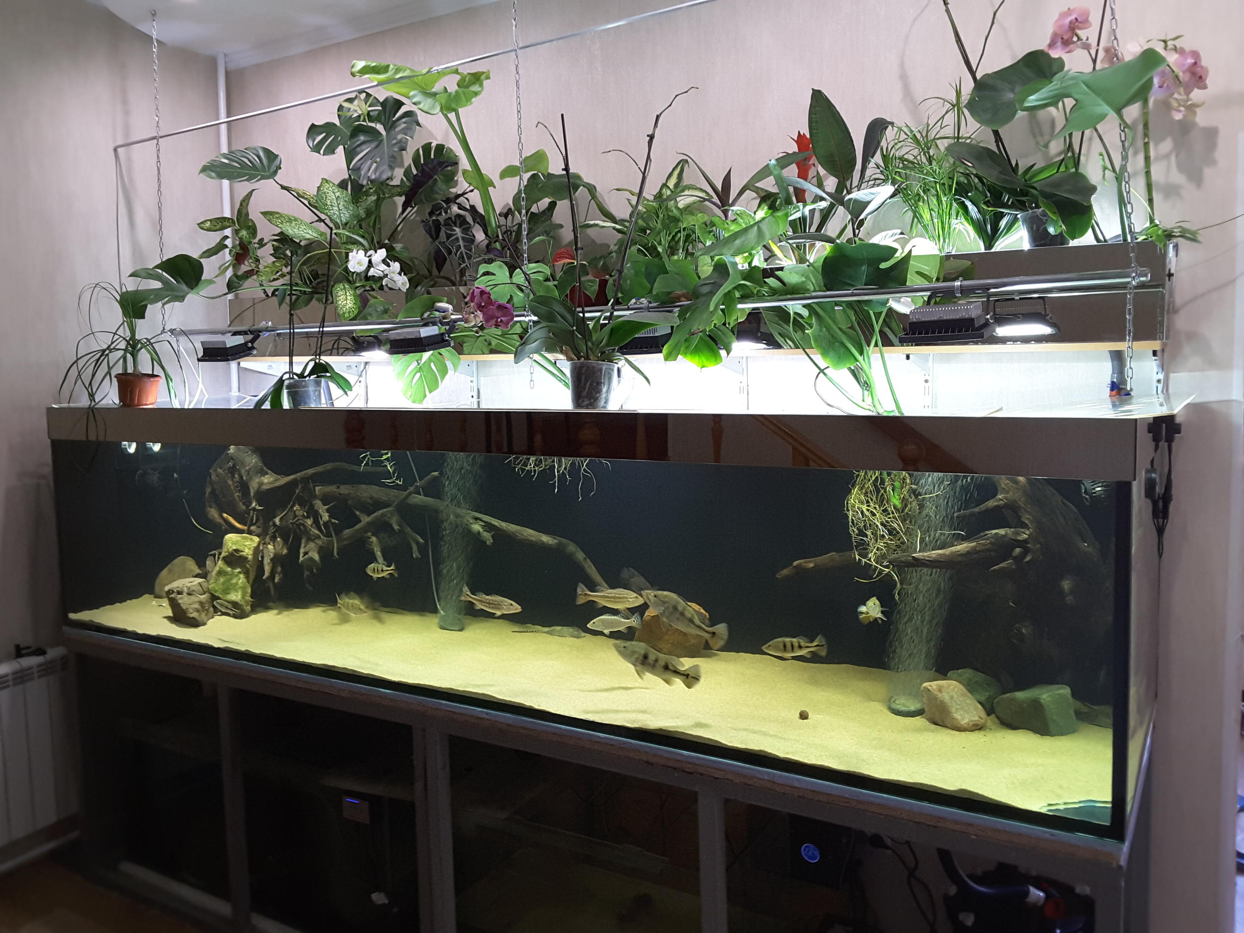 Мой аквариум на 1500л длина 3м ширина 80,высота 65,стекло 12мм,тумба с трубы квадрат 40,40 толщина 2мм,освещение прожектора лед 4шт по 20в