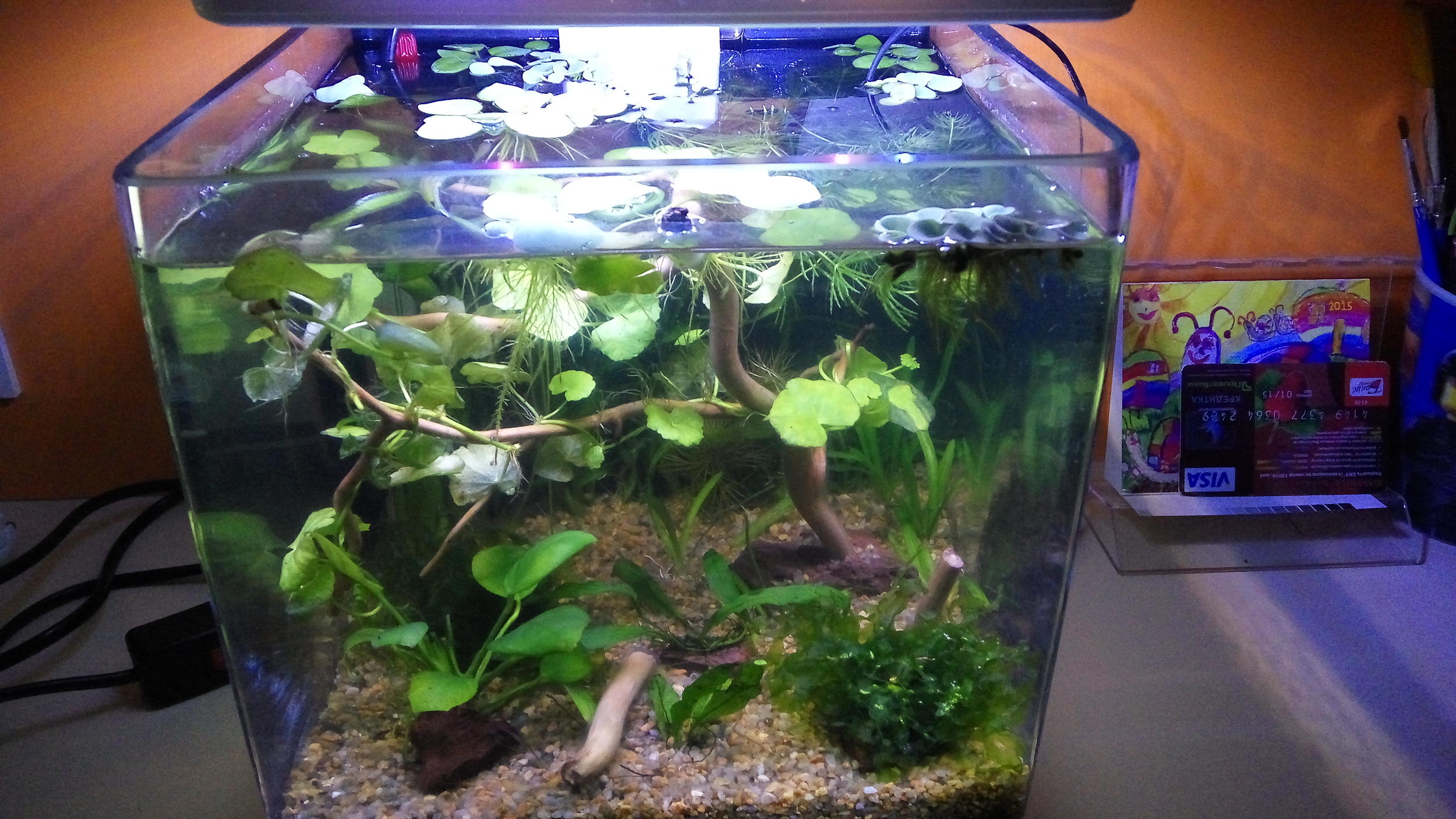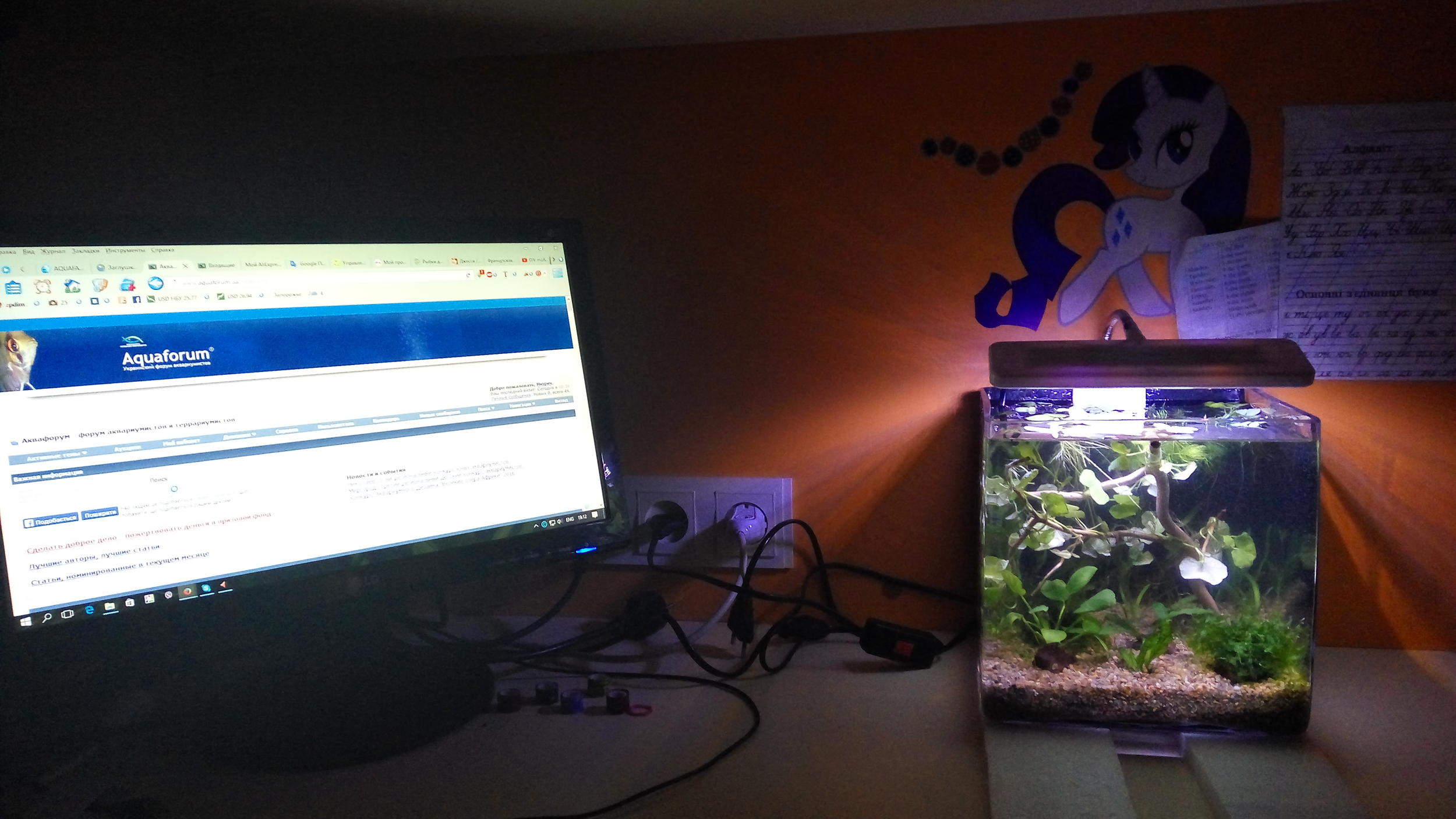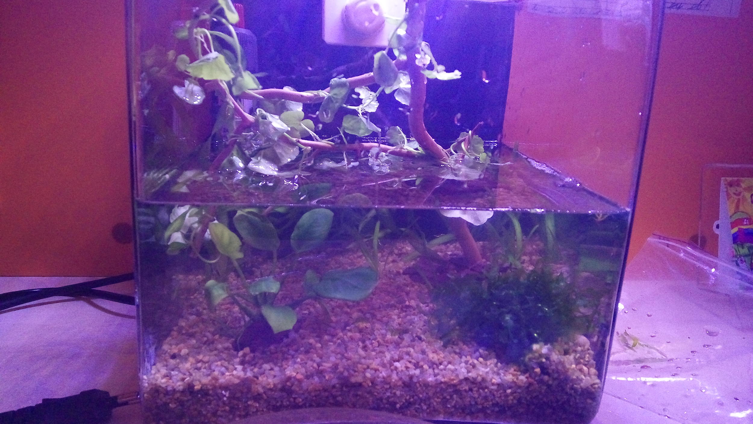 В акве установлен нагреватель, свет - переделка морского светильника с Алиэкспресс. Поменял часть диодов на более теплые и добавил красных. Фильтра нетути... Но... как то вот стремно без него... Привык я что фильтр должен быть... Поставил рядом Ресун микра- так картина, прям сказать , безрадостная... Спрятать его не куда...Он размером с аквариум... И еще эти трубки... Буду сейчас искать - смотреть чего то очень маленькое... Типа Dophin KF-150, или еще чего...А Ресун на продажу выставлю...